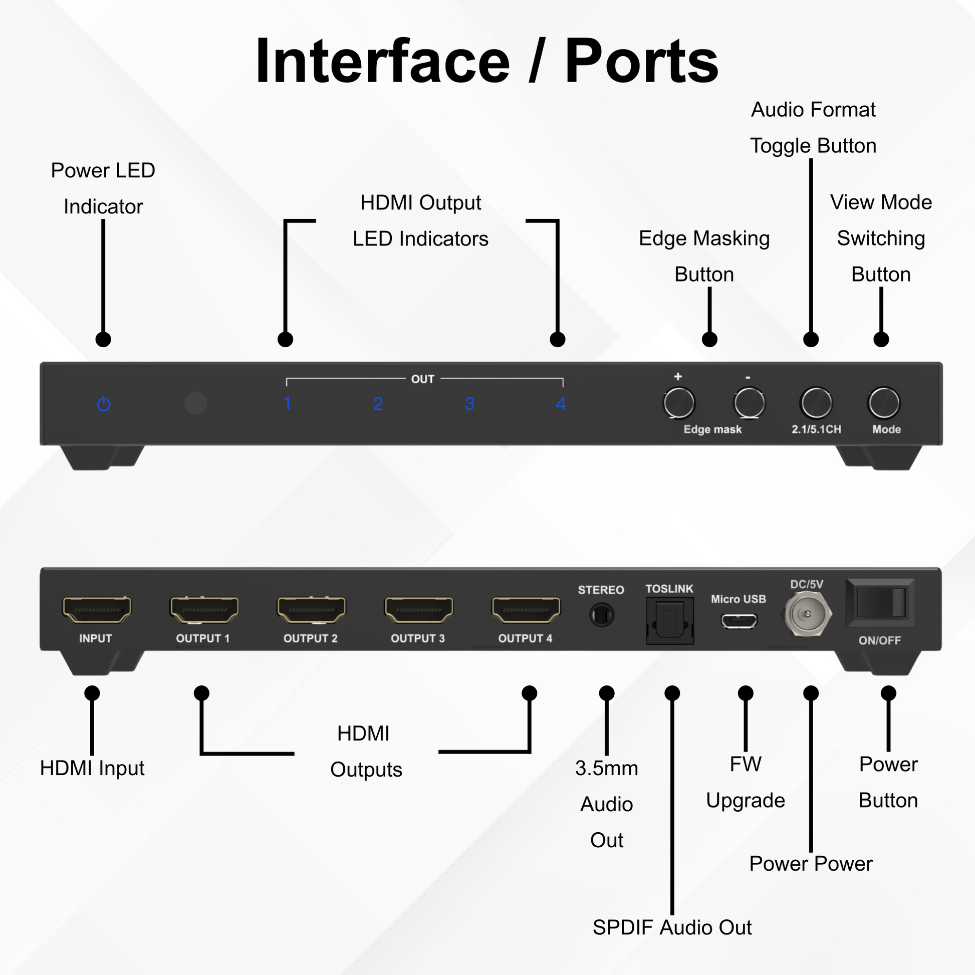 Introducing the JTECH- VW0104-AE; 4K 2x2 Video Wall Processor. This is a powerful HDMI video wall controller that combines up to four displays into one seamless large-format screen. Supporting 4K@30Hz input and Full HD 1080p outputs, this versatile controller offers 8 dynamic display modes including 2x2, 1x2, 2x1, 1x3, 3x1, 1x4, and more — perfect for digital signage, home theaters, control rooms, and commercial displays. Enjoy immersive sound with built-in audio extraction, featuring SPDIF Optical (5ch) and 3.5mm (2ch) outputs for connecting to external speakers or sound systems. Fine-tune your setup with advanced image rotation (up to 180°) and edge masking functions to eliminate bezel gaps and distortion for a flawless, professional display. Whether you’re building a multi-screen video wall or using splitter mode, this HDMI video wall controller delivers crystal-clear visuals, flexible configurations, and premium audio performance for any setup.